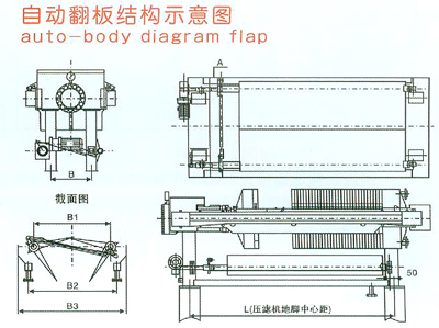 壓濾機濾板下方裝置了兩塊協調工作的翻板,在過濾過程中處于閉合狀態,將滴漏的液體或濾板沖洗水導入兩側的集液槽。卸料時處于開啟狀態,起到導泥作用。